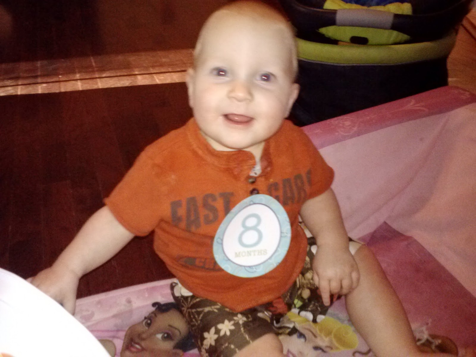 He and Andi play bumper cars together. He is dangerous in it though, plowing over everything. He absolutely loves to play with empty, plastic water bottles. He gets soooo excited when he sees me drinking from one, that he has to have it and will throw a fit for it. It entertains him for a long time, which is nice so I can get things done. The poor guy wants to be running around so bad. He can sit up by himself just fine now, he hasn't learned to get up to sitting from lying down yet. He still does the crunch up.